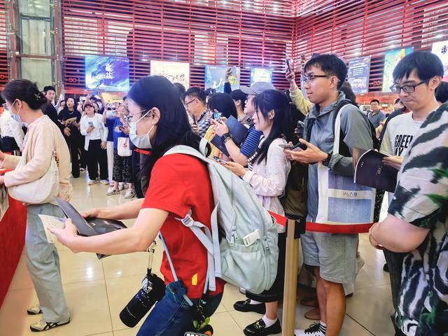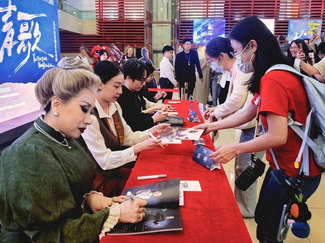 演出结束后,五位主创代表为观众签名留念,现场排起长队。歌舞演员在大厅载歌载舞,气氛热烈欢快。