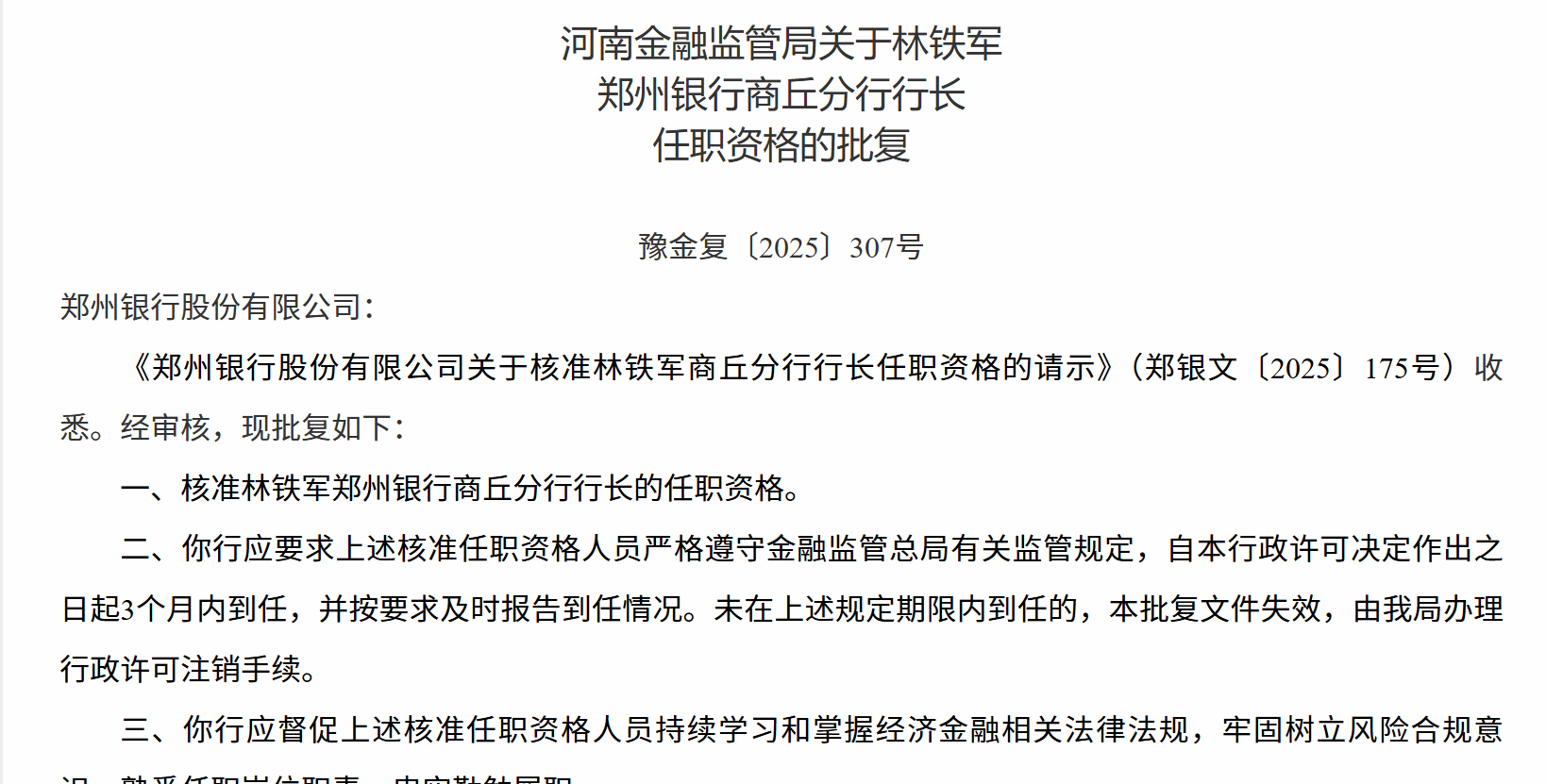12月5日,河南金融监管局发布关于林铁军郑州银行商丘分行行长任职资格的批复,核准林铁军郑州银行商丘分行行长的任职资格。
